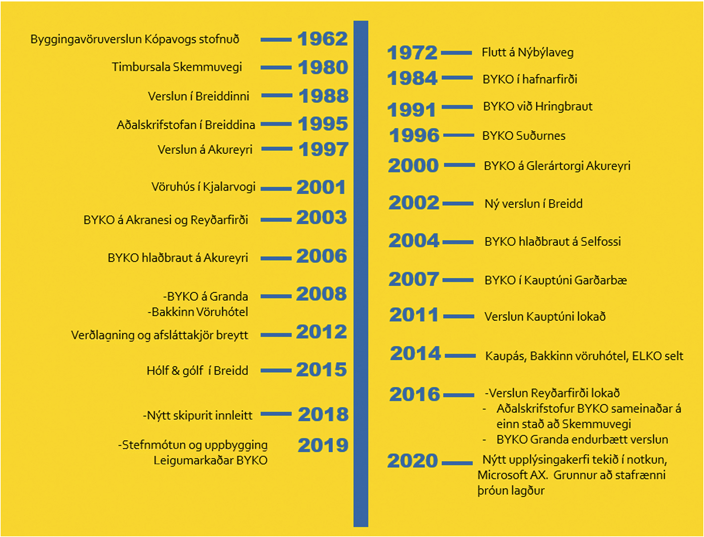 Eins og fram hefur komið hófst starfsemi BYKO 13.6 1962 í 135m2 húsnæði. Árið 1972 var verslunin flutt að Nýbýlavegi 6 og varð hún strax leiðandi verslun í byggingavörum þar sem seldar voru allar helstu byggingavörurnar á einum stað. Árið 1980 var stórt athafnarsvæði fyrir timbursölu tekið í notkun við Skemmuveg í Kópavogi þar sem nú er Timburverslun BYKO í Breiddinni og árið 1988 flutti verslunin síðan af Nýbýlaveginum í nýtt og rúmbetra húsnæði í Breiddinni. Verslunum fjölgaði hratt en í Hafnarfirði var opnuð BYKO verslun árið 1984. Önnur verslun var opnuð við Hringbraut í Reykjavík árið 1991. Árið 1995 urðu þau tímamót að aðalskrifstofa BYKO flutti af Nýbýlaveginum inn í Breidd, þar sem hún er staðsett enn þann dag í dag. Áfram hélt fyrirtækið að vaxa. Árið 1996 keypti BYKO rekstur verslunarinnar Járn og Skip í Keflavík og hefur síðan rekið þar verslun undir nafninu BYKO Suðurnes. Árið 1997 keypti BYKO svo rekstur verslunarinnar Metró að Furuvöllum á Akureyri. Þar var rekin timbursala, lagnadeild og leigumarkaður en ný smásöluverslun var opnuð í nóvember árið 2000 sem stendur við Óðinsnes og sameinaðist þar bæði timbursalan og verslunin undir einu þaki. Ný og endurbætt verslun í Breidd var opnuð í September árið 2002 og var stærsta verslun sinnar tegundar á Íslandi. Í apríl árið 2003 var ný verslun BYKO opnuð á Reyðarfirði og sama ár í júlí opnaði BYKO verslun á Akranesi sem áður var verslun trésmiðjunnar Akurs. Árið 2004 opnaði BYKO glæsilega verslun á Selfossi. BYKO opnaði síðan verslun í Kauptúni Garðabæ árið 2007 en henni var lokað aftur árið 2011 í kjölfar efnahagsþrenginga á Íslandi og samdráttar í byggingariðnaði. Árið 2008 opnaði BYKO síðan á Grandanum í Reykjavík og er sú verslun sérstaklega hönnuð með sitt markaðssvæði í huga til þess að þjóna fyrst og fremst viðhaldsmarkaði. Árið 2016 var ákvörðun tekin um að loka verslun BYKO á Reyðarfirði, rekstrargrundvöllur ekki lengur fyrir hendi. Sama ár voru gerðar endurbætur á skrifstofuaðstöðu á aðalskrifstofum BYKO í Breidd með það að markmiði að sameina allar stoðdeildir undir einu þaki. Janúar árið 2020 var innleitt nýtt upplýsingatæknikerfi frá Microsoft sem ber heitið Dynamic AX sem leysti af hólmi eldra kerfi AS/400 sem tekið var upp árið 1998. Með innleiðingu á Dynamic AX var lagður grunnur að stafrænni þróun félagsins.