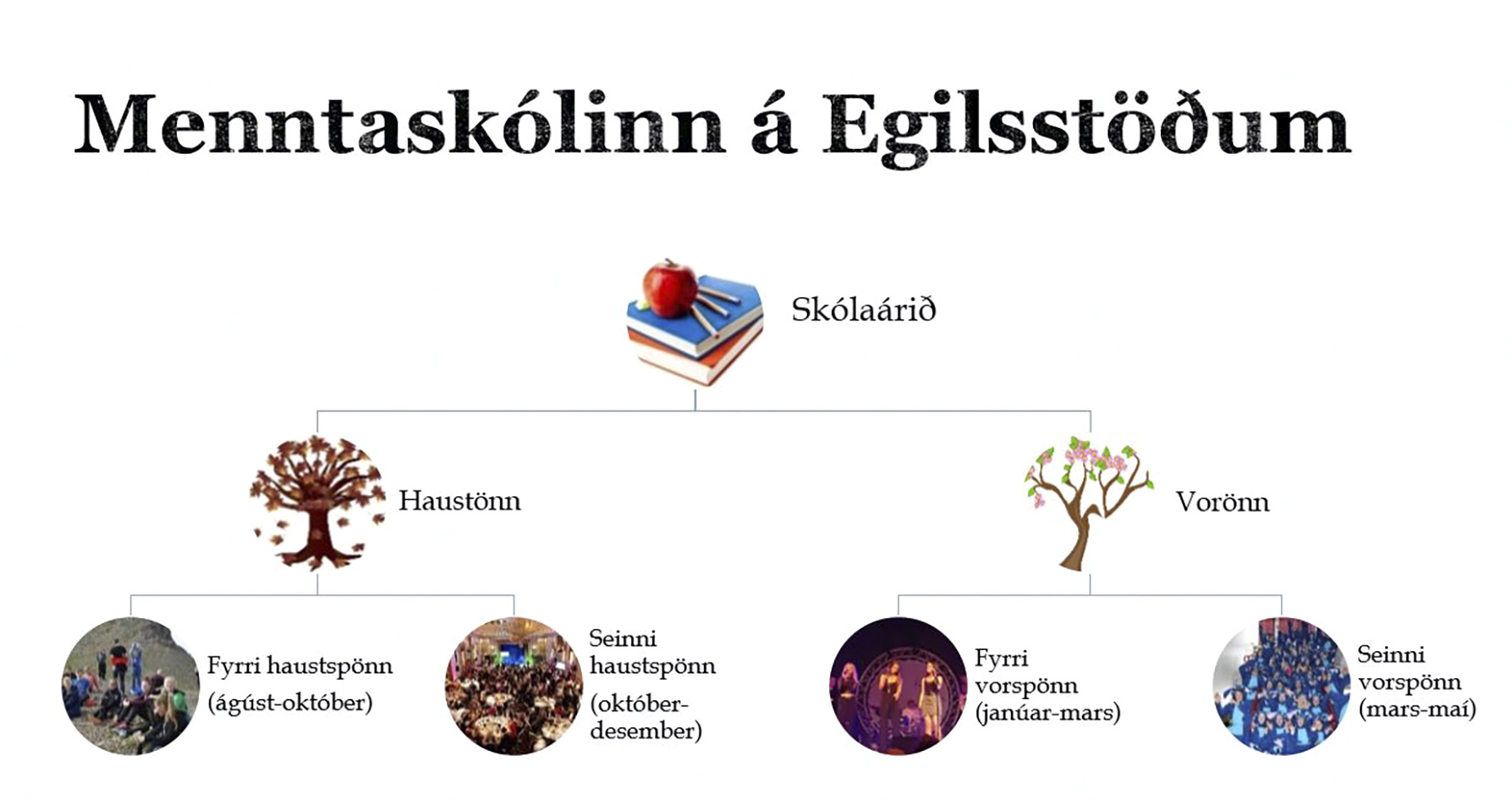 Tvær átta vikna spannir eru á hvorri önn, sjö kennsluvikur og ein prófavika. Meðalnám á hverri spönn er fimmtán einingar og lýkur nemandi því um 60 einingum á skólaárinu. Lögð er áhersla á fjölbreyttar kennslu- og námsmatsaðferðir til þess að mæta margbreytilegum hópi nemenda og því allt eins líklegt að sérstakir prófadagar líði undir lok þegar fram í sækir. Með því að skipta önninni í tvær spannir er nemendum gefinn kostur á að einbeita sér að færri námsgreinum í einu. Þeir geta því kafað dýpra í námsefnið og sinnt hverju verkefni betur.
